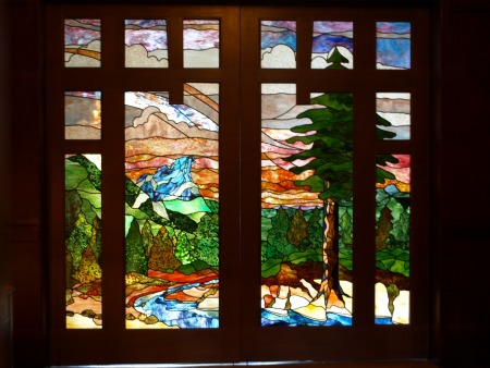 And, so, she did. She proceeded through the lobby, noting many of the details Disney included that matched with Greene and Greene's design philosophy: the use of threes in design motifs, the dark woods and natural materials, the Tiffany-style lamps and Stickley-inspired furniture. Walk into the lobby from the porte cochere and note the leaded art glass door, another detail inspired by the Gamble House. (The Gamble House's door depicts an oak tree with Ginko leaves, and not a theme park, of course.)