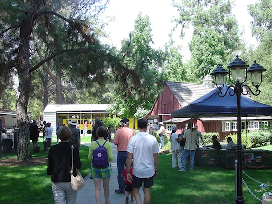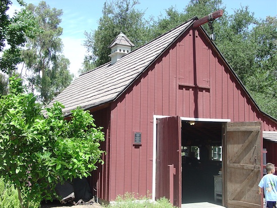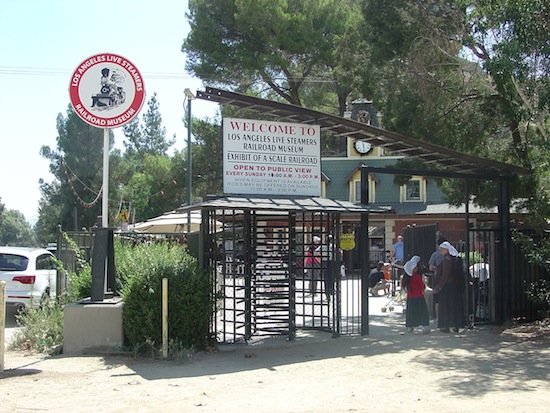 The Los Angeles Live Steamers site is in the northern part of Griffith Park, between the Travel Town rail museum to the west and the Los Angeles Zoo and Autry Western museum to the east. Entering from the east gate, which is only open when the Walt Disney Barn is open to the public, one crosses the model railroad track operated by the Live Steamers and enters a grassy park-like area containing the barn, a covered maintenance area containing railroad equipment, and a temporary structure covering a railcar from the first passenger train at Disneyland.