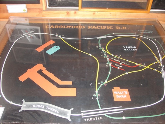 About three miles' drive from the merry-go-round, Walt Disney's barn housing his model trains and railroad equipment was transplanted from the backyard of his former home to the Griffith Park grounds of the Los Angeles Live Steamers, and is open to the public one Sunday each month, staffed by volunteers knowledgeable about trains, model railroads, and the history of the Disney parks. I visited the barn on a recent Sunday after picking up a brochure about the attraction earlier in the summer.