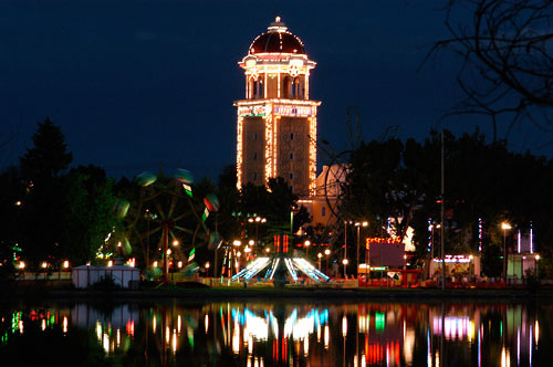 The park is dominated by a historic tower, the 150-foot-tall Tower of Jewels. Constructed in 1907, this beautiful example of Exposition architecture is covered with an estimated 5,000 lights, and is part of the original entrance complex that also housed the Casino Theater and Riviera Ballroom, all still standing but no longer used for their original purposes. Many other original structures from the earliest days of Lakeside still stand, from shelters to ticket booths, giving this park a feeling of authenticity that cannot be duplicated. At night, Lakeside glows with the lights on the Tower of Jewels and with a vast display of neon lights ornamenting the many Art Deco structures throughout the park. During the day, Lakeside is a very pretty park- at night it is a trip back in time to an era when Disneyland didn't exist and every town had its own Lakeside Amusement Park.