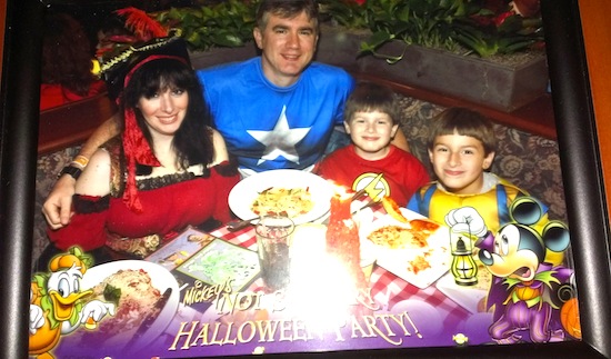 While we ate, we were treated to the many ways that Tony's make one's evening special. When our entrees were delivered, a cast member came to our table. He said he had heard that Lady and the Tramp was my favorite movie and since we were at Tony's...he then began to sing, "Bella Notte". After the song, he explained that he goes around to the tables and any that are celebrating, or are a couple enjoying a romantic meal, he then sings for them. He had a very nice voice and with the Italian food, candle lit in the old chianti bottle (another special touch for those celebrating), the soft glow from the fountain, and my entourage of superheroes; I was feeling that Disney magic. After the song, a Disney photographer came over to our table and took what would become my favorite photo from our vacation. Mr. Anderson had it developed and framed as a thank you gift for trying Tony's again. With the photo, song, and beautiful fountain, this could be a great place for a proposal if you are unable to get reservations at Cinderella's Royal Table.