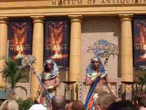 I arrived at the park at nine and took a shuttle, along with other members of the press, from the administrative offices in the back of the park to a press area just off the end of 57th Street, next to the New York Library back lot facade. We were soon brought into the park and directed to a spot directly in front of the attraction entrance. The old Pennsylvania Street Station has been transformed into the 'Museum of Antiquities'. The entire entrance was extensively decorated for a special presentation--Egyptian props cluttered the area and it appeared as if a large brick wall had been built to cover up the front