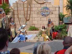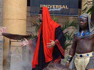 A number of Egyptian guards and princesses entertained the audience while music played. We were eventually greeted by an old archeologist character who announced that it was time to break into the resting place of Imhotep, but the wall was rather impeding progress. To stall, the archeologist introduced the mummy himself, Arnold Vosloo, who led the crowd in a rousing chant of "Im-ho-tep. Im-ho-tep."