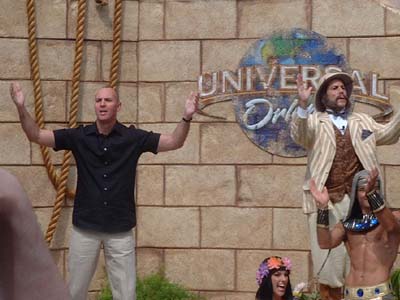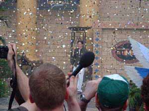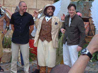 Then there's a series of larger explosions--fireworks, smoke, fire and confetti. When it's all over, we're greeted by none other than Brendan Fraser, who invites us all to join him and Vosloo for a ride.