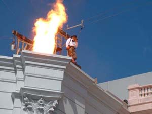 As our host tried to figure out how to break in, an evil priest suddenly appeared, exclaiming that no one would experience the ride. Naturally, the villain was wrong, as up above we see Rick O'Connell with enough dynamite to blow the entrance open. There's a small explosion and the stunt O'Connell is set on fire as he rides a zip line down to the front of the attraction.