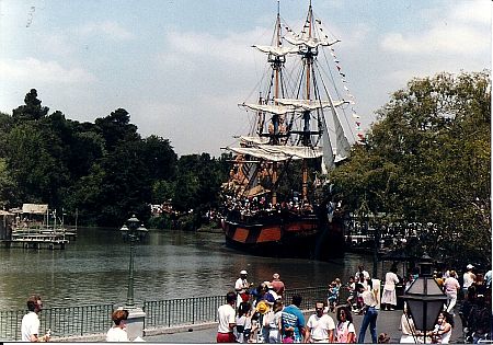 I worked most of my shifts driving Tom Sawyer's Island rafts at the MK, so I was excited to see something different on Disneyland's Rivers of America - the sailing ship Columbia, here shown on a packed day in 1990.