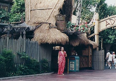 When I wanted to pick up some easy extra cash, I often extended my workday by pulling overtime at the Enchanted Tiki Room. At the MK in 1990, we wore horrid puke-yellow polyster guayaberas, which I could not bring myself to photograph. But I did not hesitate to grab a shot of this Disneyland Tiki Room hostess, in her tropical red gown, which I'm sure they hated as much as we hated our Tiki costumes.