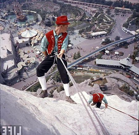 Yep. The image is reversed. Here is the image flipped to the correct orientation. Over the climber's right shoulder, you can see Captain Hook’s Pirate Ship, Storybook Land, Midget Autopia, the old Fantasyland train station and the Matterhorn dispatch station.