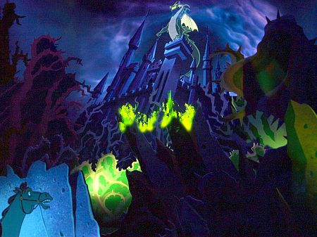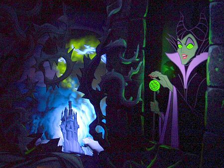 This might be the most spectacular window in the entire show. Maleficent breathes green fire onto the branches below, which catch flame.