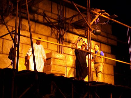 Like Backdraft, Special Effects Stages moves us through three sets, each with a filmed montage, as well as audience volunteers/draftees dragged on stage as props for the two live hosts. We're learning about the technical side of movie-making here, specifically, about green screen photography, make-up and sound effects.