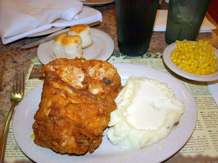 The fried chicken is fine, not as tasty as others. But the chicken noodle soup, more stew than broth, delights. And if you can beat your table mates, grab one of the crustier biscuits, which taste more like fritters than the tasteless pucks of dough you'll find from the Colonel.