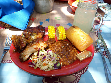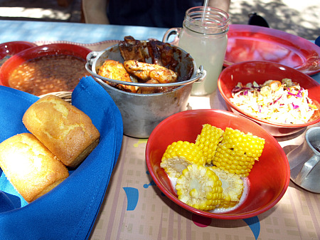 Lunch included beans, cornbread, a bucket of barbecue chicken and ribs, corn on the cob (sliced into easy-to-handle rounds) and cole slaw. Drinks are included, and Laurie and I both went with the obvious choice and selected lemonade.