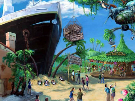 The new concept art details several of the DreamWorks Animation-themed attractions that will appear in the park. The most ambitious, Madagascar: A Crate Adventure, will be a dark ride featuring the main characters, Alex, Marty, Melman and Gloria, joining with lemur King Julien and the penguins to battle Julien's enemy, Foosa. The Madagascar section of the park will also include a Julien-themed carousel, with dance house music.