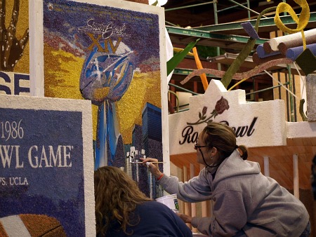 The most meta float in this year's parade? Western Asset's Rose Parade float paying tribute to… the Rose Bowl Stadium. Here, a volunteer applied detail to a floral representation of a Super Bowl program cover from one of the NFL title games held at the stadium.