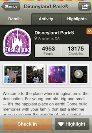 Disney has yet to offer an official mobile app for anyone other than Verizon customers (*corrected, see comment), though it has partnered with Gowalla as its official check-in app.