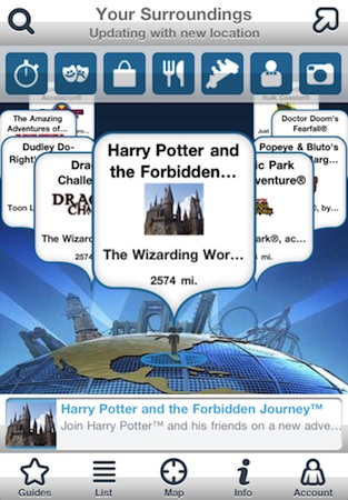Universal Orlando joins SeaWorld in offering official mobile apps. SeaWorld's app offers several other neat features, including a "car finder" (accessible under "More") that allows you to drop a pin when you leave your car in the morning, allowing you easy GPS directions back to it at the end of the day. The SeaWorld app defaults to the SeaWorld park nearest you, using your phone;'s GPS feature. (That's why you're seeing San Diego.)