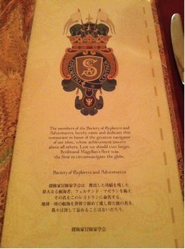 My hostess then presented me with the menu, which continued the story of the "Society of Explorers and Adventurers" who founded the citadel I'd just explored. (Take a moment to figure out that acronym, by the way.)