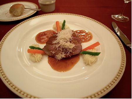 The entree was roasted breast of duck with orange sauce (in a familiar pattern...)