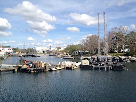 Update: Domenik was out at Universal today and took these shots of the lagoon. Coupled with the concept art, it looks like we're talking about actual physical screens for the lagoon show, and not the mist projections we saw in World of Color.