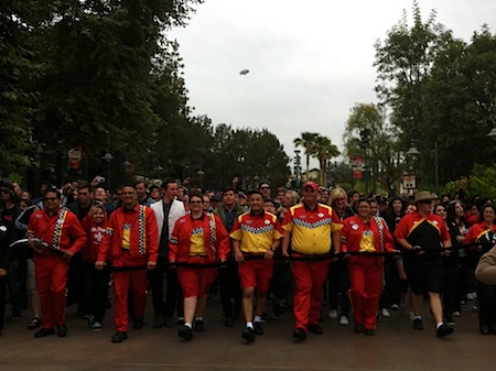 After the short ceremony, where Iger was joined by Mickey and Minnie Mouse, as well as hundreds of costumed Disney California Adventure cast members, the crew from Cars Land's Radiator Springs Racers walked the crowd back to the park's new land.