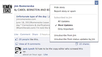 Just hold your mouse over the upper left corner of any post from a person (not from a page) on your News Feed. Then you'll see a little menu, like the one above, pop up. You can use it to tell Facebook whether you want to see "All Updates," "Most Updates," or "Only Important Updates" from that person. You also can use the menu to "unsubscribe" from all posts from that person (meaning you're still "friends" but that none of their posts appear in your feed). If you're not ready to take that step, you can unsubscribe from all of a certain type of posts from that person - such as status updates, photos, comments and likes, or - this is the really big one - game updates.)