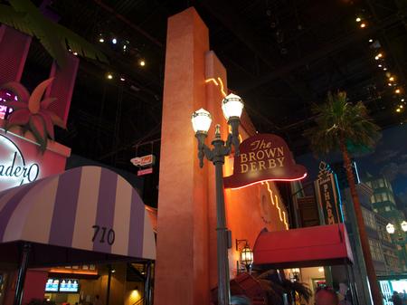But a couple steps forward revealed that the Brown Derby exterior was just a flat facade, as were all the exteriors in the building. Behind the Brown Derby wall stood an ordinary counter-service restaurant, serving burgers and chicken.
