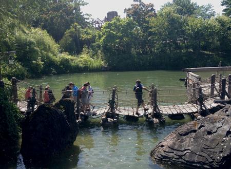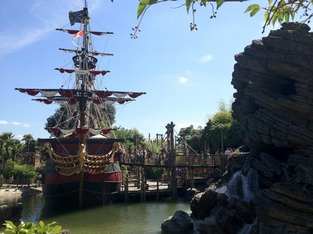 In Paris, we walk through a Spanish fortress before emerging into a tree-lined loading area. Once on board our bateau, we drift past the Blue Lagoon restaurant, then on to a more ominous sight - a skeleton lying in a skiff, adorned with a pirate flag. We approach the fortress wall, where a lift awaits to haul us up into the next section of the ride.