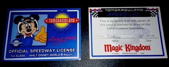 Though it is not something I relish, riding upon the Tomorrrowland Speedway with your children will give them something they will enjoy showing to everyone they meet---a driver's license. Thankfully it does only allow the young driver to legally drive at the Magic Kingdom's speedway. Our eldest, who is eight years old, tried to convince us since he passed this driving test he could most likely drive when we came back home.
