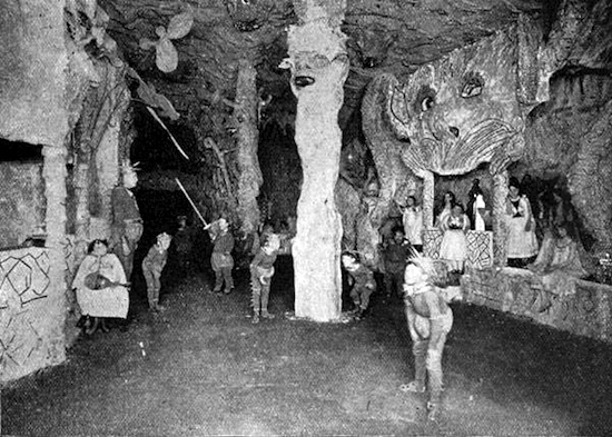 To further give the illusion of flight, several painted canvases were cycled past the ship, simulating a takeoff from New York, past Niagara Falls, through the clouds, and eventually into space and then the moon. When the ship completed its voyage, passengers would leave the ship and enter into a labyrinthine lunar cavern carefully crafted with plaster, and encounter a city of moon people called “Selenites.”