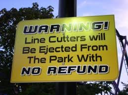The Line Cutter — Have you ever been standing in a two-hour slow moving line in the hot sun and seen somebody - or worse a handful of people with stupid little smiles on their faces - jump in line a little farther ahead, out of your reach and range of voice? Do you ever wish you had a hand grenade in your pocket for these occasions...ok maybe a little harsh, but sometimes it's the little things that bother me the most. The young ones might get a free pass. It's the ones who know better…the college age children, wannabe gangsters, mouthy teenagers, and 30-year-old adolescents that need loaded into a cannon and shot out into the parking lot…park ejection in the most literal sense. If you are a line cutter over the age of 12, congratulations…nobody likes you.