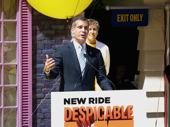After Garcetti, Lopez welcomed Gru and the voices of his daughters, Miranda Cosgrove (Margo), Dana Gaier (Edith) and Elsie Fisher (Agnes) to the stage to blow up the ribbon and open the ride. They're joined here by Tom Williams, Chairman of Universal Parks & Resorts.