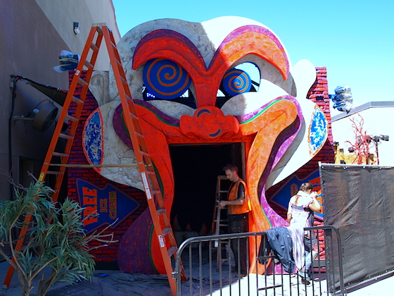 The car wasn't loaded with the clown characters this afternoon, but they were waiting outside to be installed. And, in a tribute to the maze's composer, one of the finale clowns will be modeled on Slash himself.