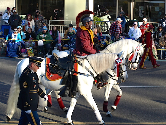 And the Grand Marshal was to be Louis Zamperini, the former Olympian and World War II prisoner of war whose very inspiring life story was told in the bestselling-book and new movie Unbroken. Unfortunately, Zamperini passed away, at age 97, after being named Grand Marshal last summer. He was honored during the parade with the traditional military honor of a riderless horse, with empty boots reversed in the stirrups.