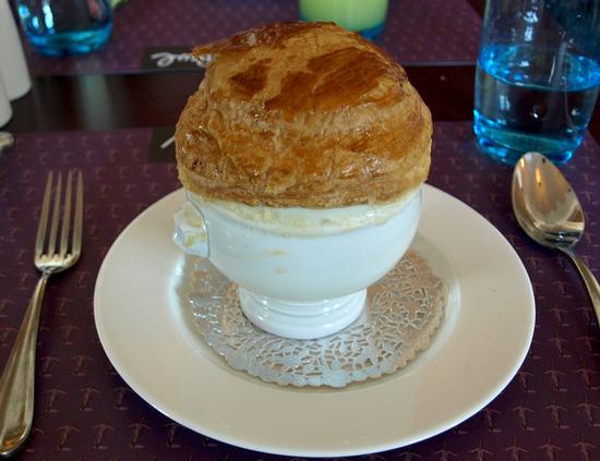 Our readers' choice for the top restaurant in the Walt Disney World theme parks, Monsieur Paul is named for legendary French chef Paul Bocuse, whose family operates both of the France pavilion's table-service restaurants. The restaurant's signature dish might be its "Soupe aux truffes VGE." Created by Bocuse and named for former French President Valéry Giscard d'Estaing (the VGE in the title), the soup offers beef broth and finely diced oxtail, carrots, onions and celery, with a larger dice of mushroom pate, flavored with generous slices of black winter truffle and crowned with puff pastry.