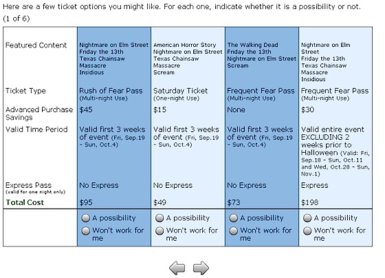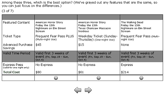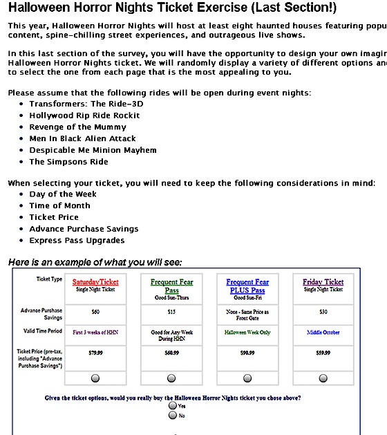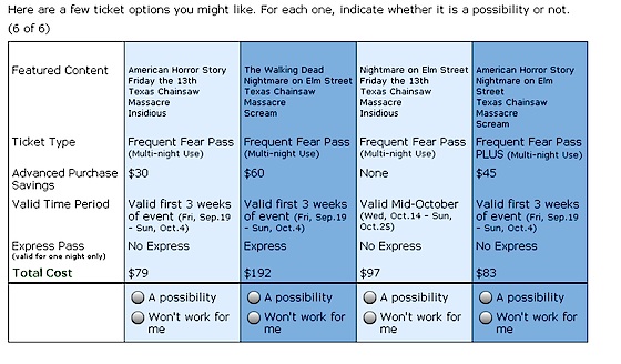 What we don't know, of course, is what's really being tested in this survey, and what are red herrings to obscure the real test variables. It's possible that Universal is testing various price points and ticket options for the event. It's also possible that Universal is just trying to gauge visitors' perceived value of the various horror brands, and that not all listed brands will be included in this year's event. Universal asked survey participants not to share the survey, so I won't reveal my snitch source. But I wouldn't put it past Universal just to troll us with a fake survey, knowing fans would republish it anyway. Which is a long way to get to: Take all of this with a block-sized grain of salt.