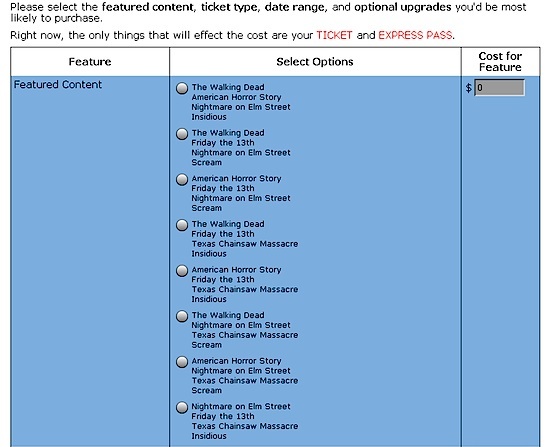The survey tests some Express Pass-style "Featured Content" tickets for select houses during the event. And yes, the survey also reveals several brands as options for this year's HHN, including American Horror Story, The Walking Dead, Insidious, Friday the 13th, Nightmare on Elm Street, Scream, and Texas Chainsaw Massacre.