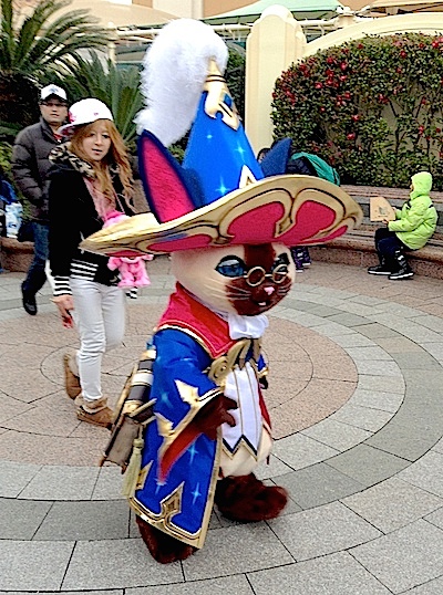 Yes, apparently this bipedal cat in the wizard sombrero is a Felyne, a species that aides the titular characters in the ‘Monster Hunter’ series. He (or she?) was making a pretty loud meowing sound while being led from the character greeting area, a parade of teenagers following behind.