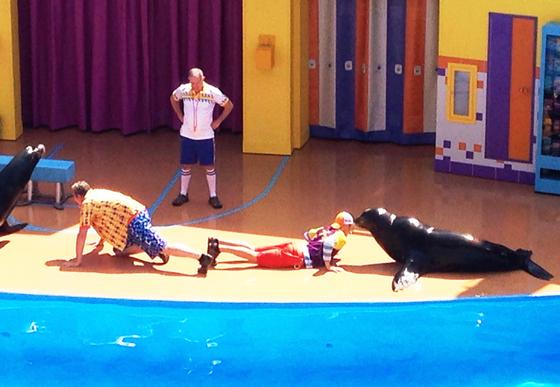 Everyone gathers on stage as Clyde and Seamore are awarded the scholarships as a result of their successful rescue. The show ends with a festive celebration featuring the cast, including a lovable walrus, and they sing and dance as they audience exits the stadium.