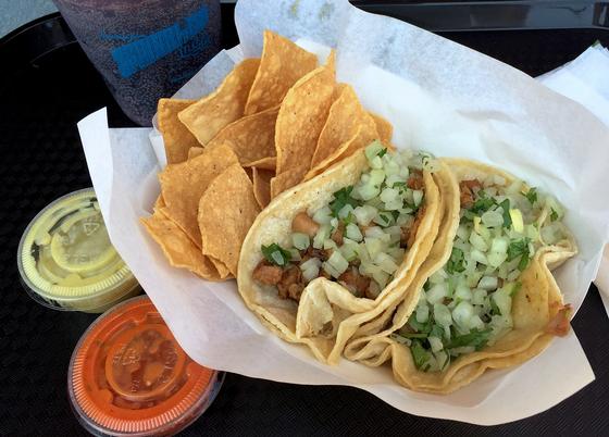 I ordered the Chicken Tacos ($7.99), which includes two tacos, a side of tortilla chips, and red and green salsas. These aren't your Americanized, Taco Bell-style, hard-shell tacos swimming in lettuce and cheese. No, Bumblebee Man stays true to his fake roots with a Mexican-style taco, each one served in two thin, warmed corn tortillas and topped with a generous helping of chopped onion and cilantro. (There's lettuce and cheese on the tacos at Orlando's version of Bumblebee Man's, for what that's worth.)