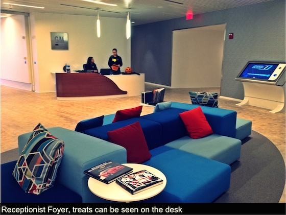 After a quick elevator ride, we arrived at the receptionist foyer. She insisted we had to say "trick or treat" before she would give us any sweets from the carved pumpkin on her desk. They had us sign a visitor log and, after doing so, we were on our own to explore!