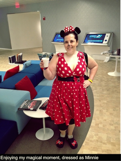 Since I don't work for any of the companies I mentioned above, I never thought I would have the opportunity to get to know one of these areas up-close. Therefore, when we headed for Epcot on the morning of Halloween Day 2014, my husband and I had no idea we were in for a real "treat." We were just enjoying the rides through Future World that morning, as we normally do when visiting Epcot. When we were walking through the GM Vehicle Display area (after experiencing Test Track), a young girl stopped us. I thought to myself: either she wants us to fill a survey or to get our personal information for marketing purposes but I stopped and smiled at her anyway (and boy, am I grateful I did). She complimented our costumes (did I mention it was Halloween?) and invited us to come up to the GM lounge! She explained it was only for GM employees but they wanted to do something special because of the holiday and they liked our costumes and decided to "treat" us. My husband and I must have looked a little puzzled because she immediately added there was a great view of the park and we would get beverages and candy upstairs. She even said we would receive a Fastpass to experience Test Track again that day. Wow, like we needed that to seal the deal!