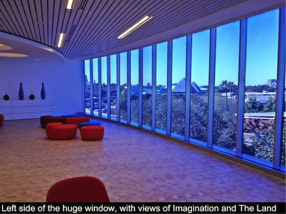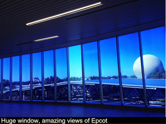 Now, the most impressive moment. The moment that makes it all worth it: we walk through this small corridor to find the most amazing window on the other side. Best views of Epcot I have ever experienced! Here's a taste: