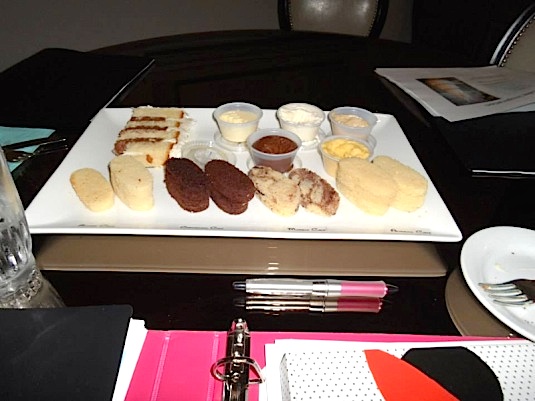 At this time, we also planned a small ceremony rehearsal for the day before our wedding to make sure everyone involved knew what to do on the day of the wedding. We had a cake tasting and chose the type of cake we would be cutting at our reception. Finally, we organized a dessert party we had planned as a nightcap to our wedding in the Italy pavilion just before the Illuminations firework show. Beyond the logistical aspect of the planning session, this was also the time where we finalized the enhancements we were adding to our package. Whether it be a confetti cannon, themed entertainment, or character appearances, Disney offers a wide array of enhancements for their wedding packages. After visiting Franck’s Bridal Studio, we were off to the Boardwalk convention center to taste food and decide what to serve at our reception. Here we were offered a wide array of choices that all tasted amazing. Since our wedding was being held in the morning, we had more of a brunch reception with a mix of lunch and breakfast foods. The chef and waiter at the tasting were extremely helpful in accommodating allergies and answering any questions we had about the food that we chose.