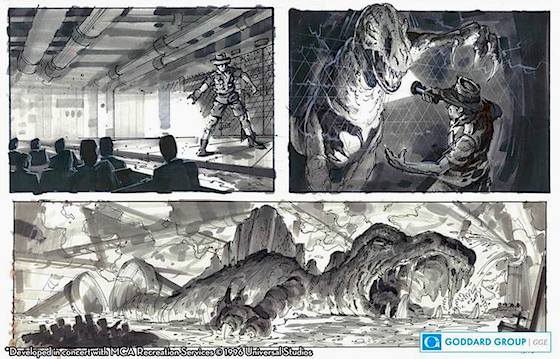 In earlier schemes, JURASSIC PARK: THE RIDE's climactic indoor sequence would have been significantly more expansive than in the finished attraction. Shown here in these never-before-seen storyboards, one concept involved a live actor who would attempt to evacuate riders before falling victim to a startling raptor attack!