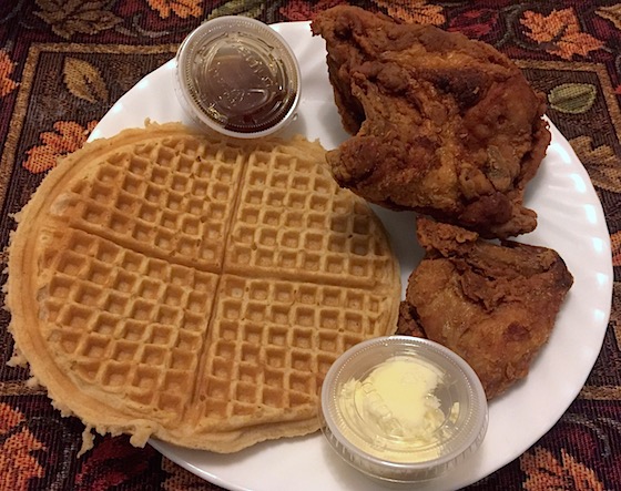 As you can see, this is a sit-down meal. You've got one enormous, freshly pressed waffle, with a hint on cinnamon in the batter, paired with two pieces of delicious fried chicken. Personally, I'd take Roscoe's fried chicken over Mrs. Knott's or even Disneyland's Plaza Inn. (But I am eagerly awaiting the debut of the refurbished Mrs. Knott's Chicken Dinner Restaurant at Knott's Berry Farm next year. I will need to collect more data to test my hypothesis, you know. Science!)