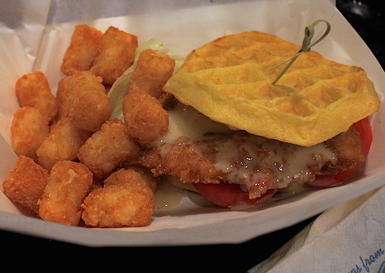 And now, for something completely different, let's head over to Walt Disney World's Magic Kingdom for the Sweet and Spicy Chicken Specialty Waffle Sandwich at Sleep Hollow Refreshments.