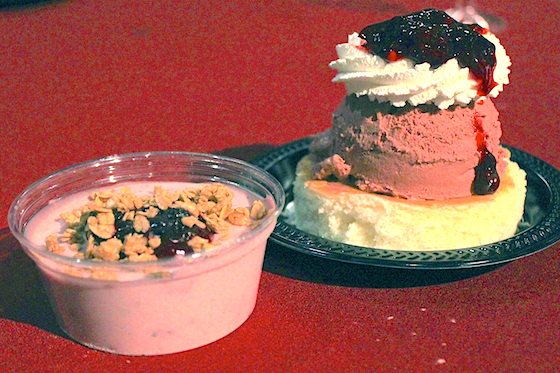 New desserts this year also include a Boysenberry Panna Cotta, served with granola and boysenberry topping, and what Knott's is calling a Boysenberry Trifle. That's a scoop of boysenberry ice cream atop a vanilla cake slice, crowned with whipped cream and more of that boysenberry topping. (Panna Cotta $3.99, Trifle $7.99 at Ghost Town Bakery)