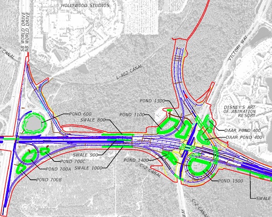 In plans filed with the South Florida Water Management District this week (Application #160506-11, if you want to look it up), Reedy Creek detailed the new interchange, which would be located southeast of the studios theme park.