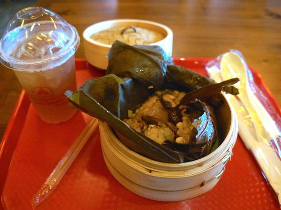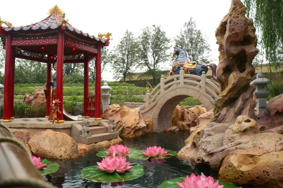 I felt overwhelmed at the food choices in the park. About 70% of what you find is Asian-inspired, and, as fan of it, I was thrilled. On the first day I had lunch at the Wandering Moon Teahouse, the most Chinese of the options, located in the Gardens of Imagination. Surrounded by a Chinese setting, I ordered an Eight Treasure Duck — a seasoned Duck with rice, vegetables and other ingredients I could not identify. Delicious. To drink, a Peach Ice Tea which sounds simple, but was very tasty. Too bad the souvenir cup in the shape of a Bamboo was not available.
