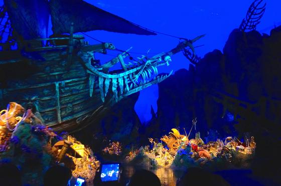 It feels like good old Pirates at the beginning, with the Barbossa's Bounty restaurant taking Blue Bayou's place at our right, followed by a talking skull as we enter a dark cave. There's a perfect nod to the original ride, with the three pirates and a dog scene recreated with a dark twist: they all died while waiting for the damn key! It looks as though it will be more of the same until, right in front of you, magic happens and a simple skeleton becomes Jack Sparrow's talking, perfect Audio-Animatronic (I've ridden it three times, and still wasn't able to find out how that piece of visual effect happens!). From then on, we are sent to the bottom of the sea where we glimpse the sunken treasures and meet the evil Davy Jones (another amazing Animatronic), which then send us back up, in the middle of the naval battle.